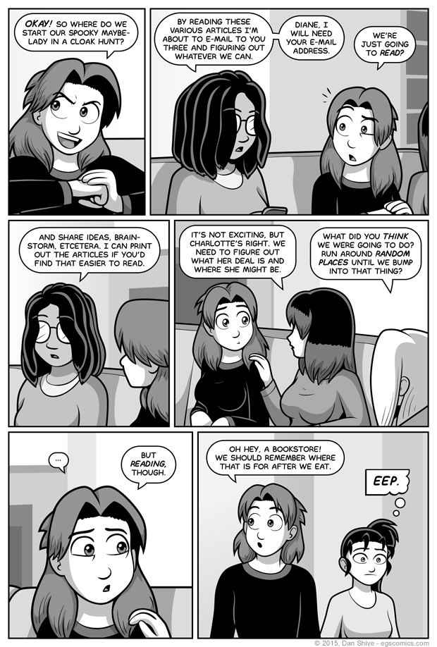 Creating this comic gave me flashbacks to various college group projects in which I would inevitably take on the role of group leader by simple virtue of nobody else taking that initiative (in spite of my hoping someone else would), and commonly be grouped with a bunch of Ellens.
