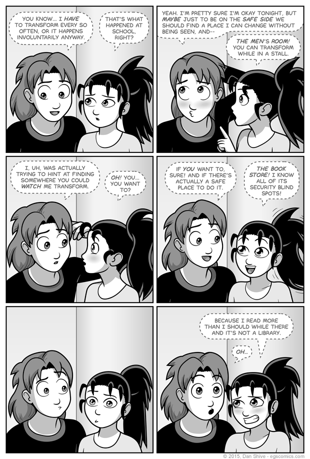 Ashley was originally going to say "morph for a bit in a stall" in panel two, but "transform while" makes more sense, and that original wording was just... something. It was werid. The change was for the better.