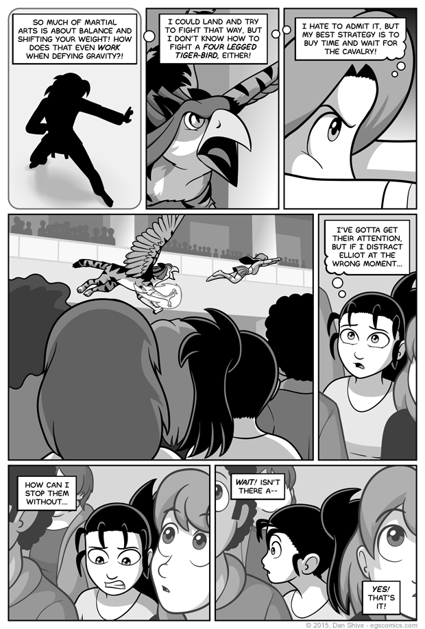 I suppose I could have left "flying makes it weird and I clearly haven't practiced it" and "how the heck do you use martial arts skills intended for fighting other people on a griffin" for people to conclude themselves, but darn it, why Elliot isn't just swinging at the Griffin is important enough to make sure it's clear.
