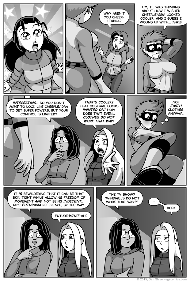 Hah! Reference humor. Speaking of which, Charlotte was originally going to compare Elliot's super hero costume to the 90s X-Men animated series (with identical levels of disapproval from Diane), but how could I have diane say something "doesn't work that way" and NOT have Futurama be the thing that gets mentioned?
