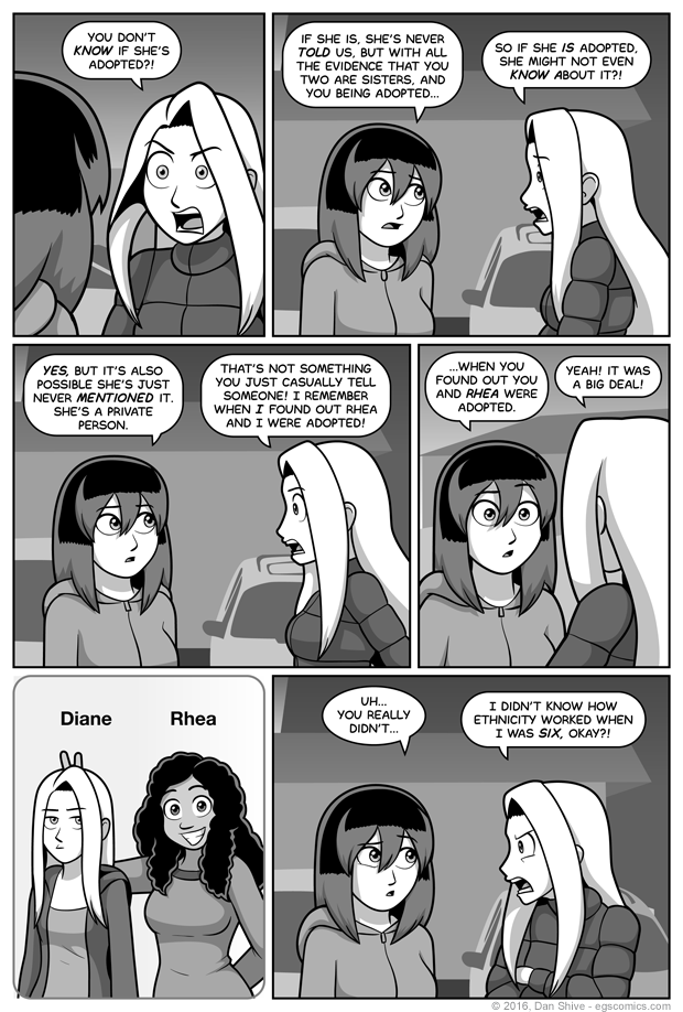 I used to think of Diane's knowledge of her own adoption being just something she'd have always known because it was obvious, but it occurred to me that I was looking at the situation from an informed adult perspective. Diane's perspective during the first few years of her life would be significantly different, and I find it interesting to consider that perspective.