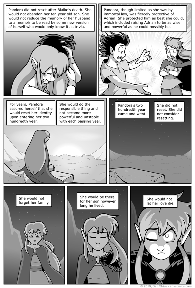 As for Pandora herself, I wanted her "immortal" outfit to seem out of place and take inspiration from elsewhere. I originally considered having her dress in something distinctly Ancient Greek, but then I sketched her with something of a genie scheme, and it seemed extremely appropriate for her character. I also felt it made a nice parallel to what she'd wind up wearing later.