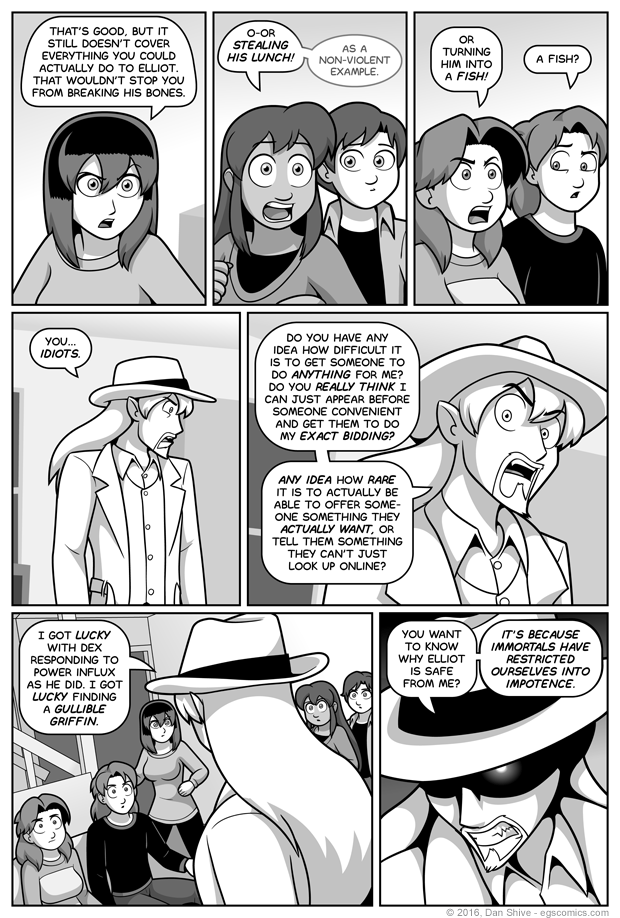 Contrary to Voltaire's rudeness in panel four (seriously, Voltaire, rude), these are excellent points to bring up in response to Voltaires vow not to get Elliot killed. People have also brought up additional loopholes that one could use to get around Voltaire's vow and harm Elliot.
