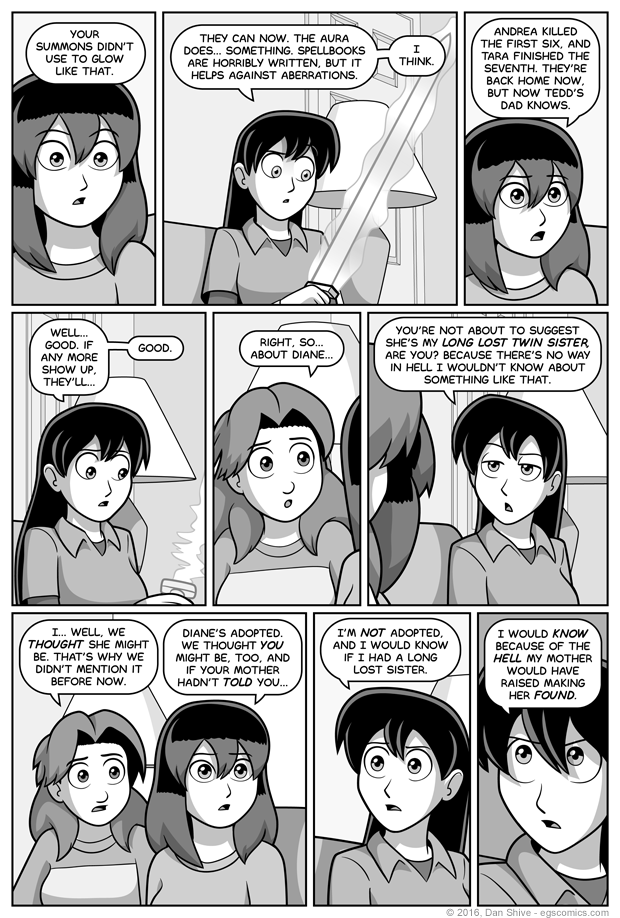 El Goonish Shive Introductions The Goo Shade, Part 1 Q&A #1 Shade, Part 2 Relations, Part 1 April Fools Week Relations, Part 2 Catnip Sister Part 1 - Open The Box Part 2 - Read The Rules Part 3 - Set Up The Pieces Part 4 - Play The Game Part 5 - Knock The Board Over Part 6 - Scattered Pieces Part 7 - Fist Fight Part 8 - Clean Up New And Old Friends Flipping Cardboard Lady Mysterious II slooF lirpA Squirrel Diplomacy Lunchtable Revelations Night Out Part 1 - Martial Arts Crew Part 2 - Elliot's Crew Part 3 - Ellen's Crew The Morning After Q&A #2 Tam Eh Tedd Painted Black Part 1 - Walk In The Park Part 2 - Missing Persons Part 3 - Interviewed By The Devil Part 4 - Into The Dungeon Part 5 - The Truth About Grace Part 6 - The Brewing Storm Part 7 - Fallen From Grace Part 8 - Humanity PB Special Features Shadows After Dark Sleepy Time Second Life The Child Left Behind Red Alert Before The Party Moping Squirrel Intro to South Party Recruiting Even More Recruiting Party Fashion Family Reuinion Grace's Birthday Party Part 1 - Arrivals And Presents Part 2 - Bending Genders Part 3 - Festivities Part 4 - Hold On Hope The After Party Q&A #3 Hidden Genesis Hidden Genesis In The Shadows The New Students Susan Draws The Line Squirrel In The Classroom Sister 2 Part 1 - The Trials Of Susan Part 2 - The Statue Part 3 - Pent-Up Magic Part 4 - Evil Monkey Part 5 - Moperville News Part 6 - Weregirl Part 7 - The Dark Clouds Gather Part 8 - Talon vs. Scythe Part 9 - Wrath of God Part 10 - Pandoras Box Q&A #4 Q&A #4 Bringing Silly Back Indiana Elliot And The TOSF T-Minus The Demon Ally Hammerchlorians - 1 Hammerchlorians - 2 Hammerchlorians - 3 T-Minus Dark Allegiance New And Old Flames - 1 New And Old Flames - 2 New And Old Flames - 3 New And Old Flames - 4 New And Old Flames - 5 New And Old Flames - 6 Q&A #5 Q&A #5 9001% Serious One Way Road Legends of Celida Death Sentence - 1 Death Sentence - 2 Death Sentence - 3 Death Sentence - 4 Death Sentence - 5 What Is Love Summer The End Of Spring Power Fantasy Rocks Fall Nobody Is Hired Nepotism Hair By The Numbers Duel Of The Discs There Be Whales Here There Be Whales Here Pt 2 There Be Whales Here Pt 3 The Dawn End Of An Era End Of An Era pt 2 Family Tree Family Tree Part 2 - Arrival Family Tree Part 3 - Par-TAY Family Tree Part 4 - Weirdness Family Tree Part 5 - A Troll Family Tree Part 6 - Banhammered Family Tree Part 7 - Hangover Q&A #6 Identity Identity Part 2 - Reactions Identity Part 3 - Cat Attack Identity Part 4 - Detective Sarah Identity Part 5 - Basement Chat Identity Part 6 - ILLOGICAL! Identity Part 7 - Dreams identity Part 8 - Ashley Identity Part 9 - Detective Susan Identity Part 10 - Ashley and Elliot Identity Part 11 - Epilogue Summer Moments Guest Comics Guest Comics #1 Guest Comics #2 Pandoras Box Squirrel Prophet SP - Part 2 SP - Final Battle So A Date At The Mall So A Date - Part 2 So A Date - Part 3 So A Date - Part 4 So A Date - Part 5 EGSNP - Question Mark Q&A 7 - The Requestioning Sister 3 - Catspaws Part 1 - Legacy Part 2 - The Will of Magic Part 3 - Reply Hazy Part 4 - Everyone Needs To Talk Part 5 - The Reservoir Part 6 - Maybe Sisters Part 7 - An Unkindness Part 8 - Awkwardness Ahead Part 9 - Traffic Freeze Part 10 - Fluidity Part 11 - All Of The Curse Words Part 12 - Misanthropy Part 13 - In Search Of Wisdom Part 14 - Sister Anxiety Part 15 - Elliot and Ellen Part 16 - BFFs Part 17 - Great Fairy Godmother Part 18 - Gathering Monsters Part 19 - Family Meetings Part 20 - Geminis Part 21 - The Other Dunkel Part 22 - Apocalypse Part 23 - The Fate Of Magic Part 24 - Elliots And Ellens Part 25 - Changes Part 26 - Epilogues The New World The Legend of Diane The Secret of Sam Q&A 8 - The Lord Of The Q&As Title Pending Title Pending 2 - Even More Pending Title Pending 3 - Untitled Party Title Pending 5 or 6 Balance Part 1 Part 2 Part 2-B Part 3 Part 4 Part 5 Part 6 Part 7 Part 8 Part 9 The Road Ahead Brother Father Our Future Recruitment Layers, Part 1 Layers, Part 2 Layers, Part 3 Layers, Part 4 Hope, Part 1 Hope, Part 2 Hope, Part 3 Hope, Part 4 Hope, Part 5 Hope, Part 6 Hope, Part 7 Hope, Part 8 Hope, Part 9 Hope, Part 10 Hope, Part 11 Hope, Part 12 False Kings False Kings, Part 1 False Kings, Part 2 False Kings, Part 3 False Kings, Part 4