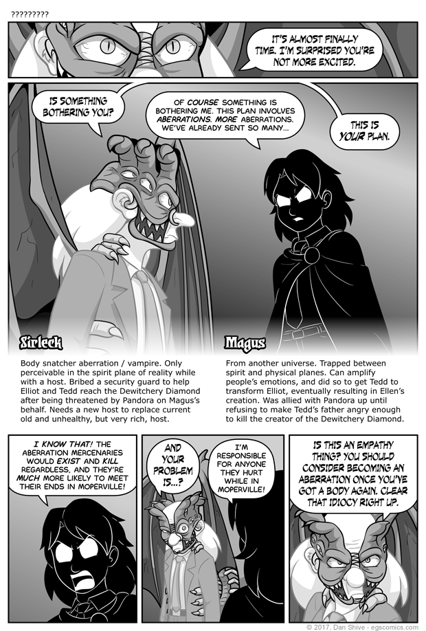 Speaking of reminding people of things, the mouth of Sirleck's host remains closed in this comic because it is Sirleck talking directly, and not via the host. No one on the physical plane would be able to hear him talking in this manner.