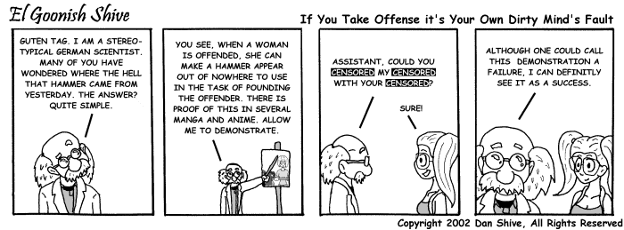 The hammers were inspired by a trope I’d seen in anime in which angry female characters would suddenly acquire weapons out of nowhere, usually in response to a man angering them. The anime that comes to mind is Ranma 1/2, which Is appropriate enough given future events which will occur in this comic.