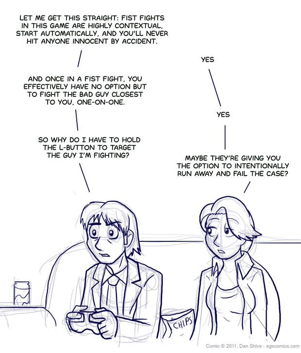 ANYWAY, the game being referenced in this comic is LA Noire, a game which, I would like to emphasize, is an M-rated game and definitely not for kids. I'm not even sure if there's any justification for rating a game "M for Mature" that isn't on the back of the box, and rightly so. I don't buy into the idea of a game like this warping young minds, but I can certainly see it troubling and disturbing young minds. Please note that I'm basing this on it successfully troubling and disturbing my adult mind.