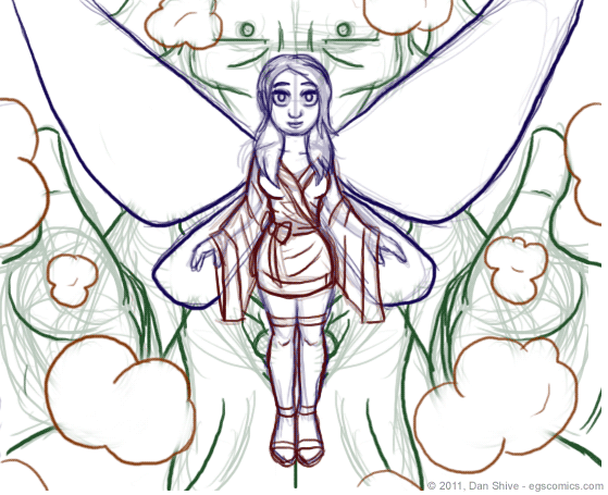 this comic. This was one of the more complicated bits of sketchery I've had to do due to how the two characters layer and the clouds. One of the benefits of sketching entirely on the computer, however, is that instead of erasing along the way, I can just put things on separate layers, use different colors, and have layers with areas of whiteness between them to keep everything looking clean.