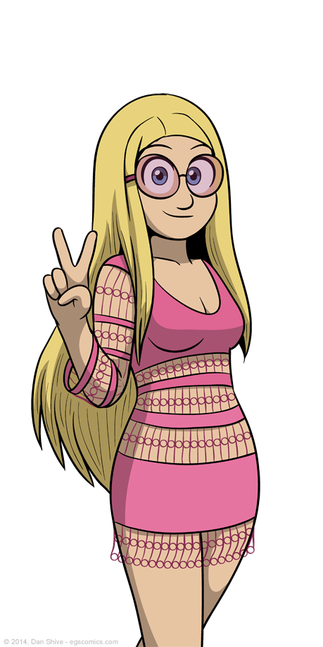 My solution was basically just to give her really long hair (presumably grown naturally), and tinted sunglasses. Neither of those things necessarily say "older", but she still sort of looks older to me? Maybe? I dunno. I tried, Robert. I super tried!
