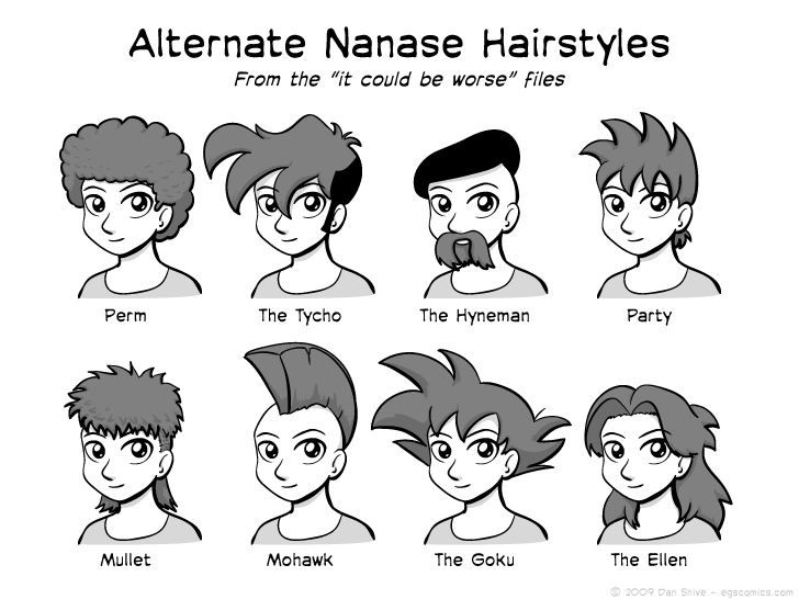 "the Rachel"As much as this is supposed to be an example of bad haircuts for Nanase, I can't help but like how some of these work. "The Ellen" looks great on Nanase, and it's vaguely disturbing how nice "the Tycho" and "the Goku" styles look, particularly given that "The Tycho" has sideburns.