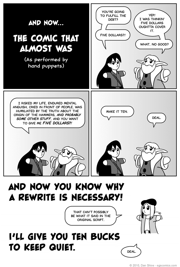 Anyway, I wanted to have something worth seeing up today even if I couldn't have a story comic, but I didn't want to take away too much time from being able to work on said script, so... PUPPETS! The joke is probably older than the invention of puppets, but I think it's cute, so everyone else probably will too, right? ...Right?