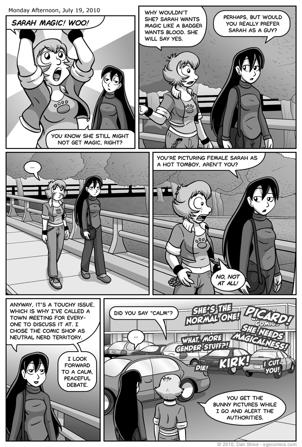 Unless, of course, there actually is calm, peaceful debate going on. I refuse to accept this. I made a comic cliffhanger with the intent of it being apocalyptic in its impact, and darn it, I'm going to assume that it has done just that!