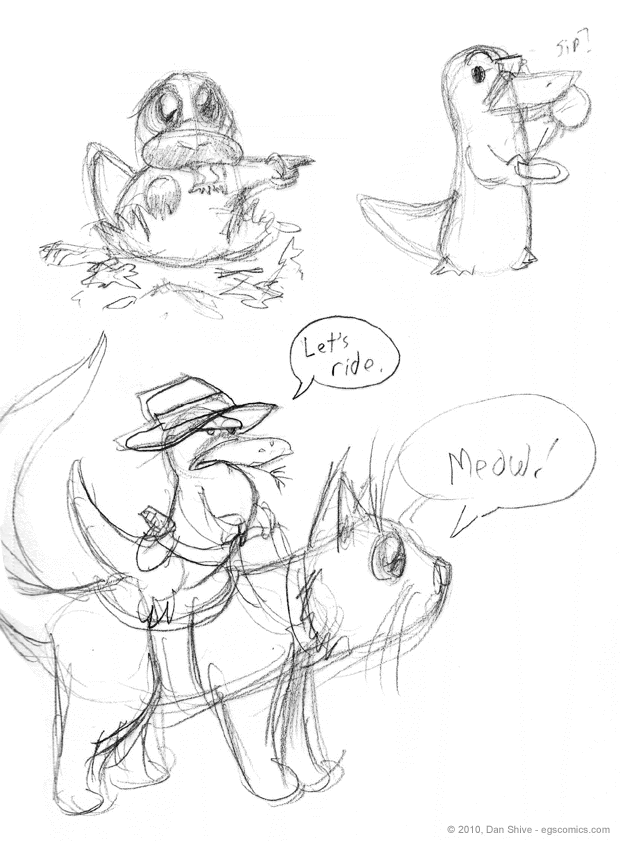 I don't feel I need to explain the second one (who hasn't pictured a Platypus riding a cat? Don't try to replicate it, though; platypi are venomous, and I doubt either would appreciate it), but the first one may be a bit too sketchy: