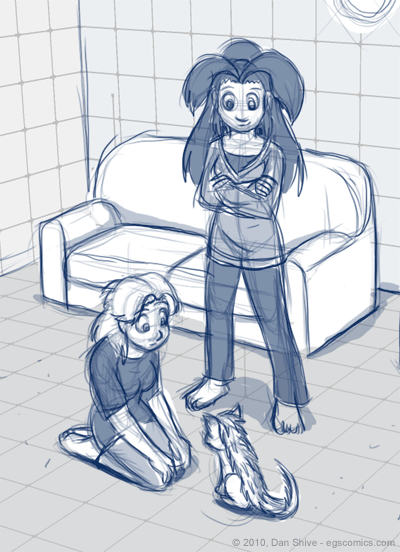 I have some complex sets made in 3D to help speed up EGS's production, but a good set can take time I may not have before I need it, making a bit of a paradox. There's also the simple issue that I may very well use Tedd's basement ten bajillion times, but the scene of a random cut-away joke or something may only exist for one panel.