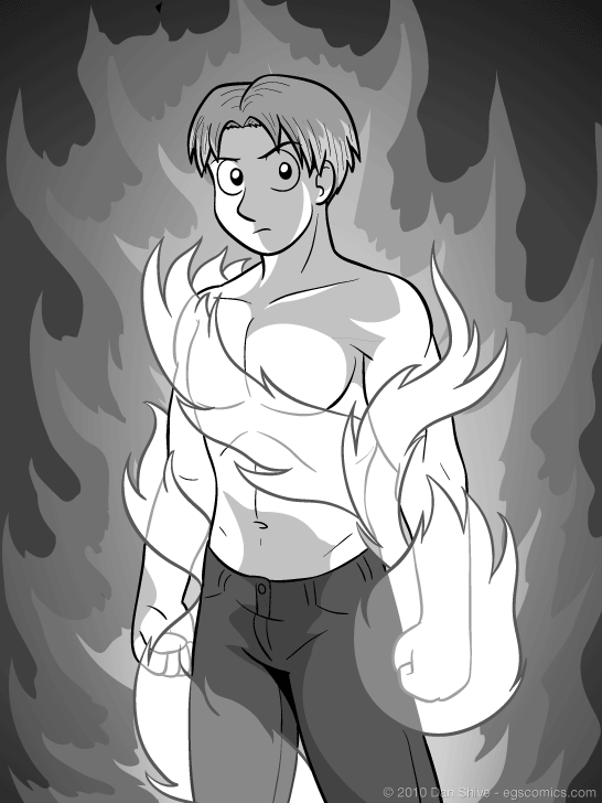 ANYWAY, I wanted to practice drawing male musculature, so I drew Justin standing around with his shirt off. That seemed a bit dull, SO I SET HIM ON FIRE.