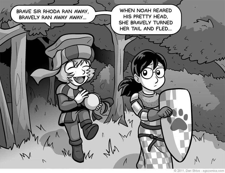 As far as has been established, Catalina and Rhoda have never met in canon, but I do think of them as being connected in a strange way. Catalina is the spirited cat of Moperville North, and Rhoda is the timid puppy of Moperville South. That, and Catalina seemed perfect for the role of a bothersome minstrel.