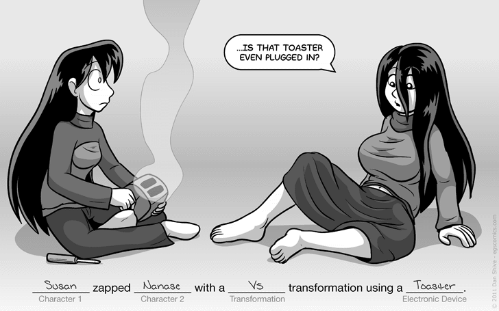 "I have four blanks in a sentence to fill. Character 1, Character 2, a transformation, and an electronic device. Vote for each blank."I say "eventually" because I had to restart the voting and clarify some things after people were voting for things that no one else would vote for. For example, there aren't likely to be repeat votes for a "winged purple kitty with bobcat ears" transformation, but six people voted for "half-cat". The less obscure / specific, the better the odds.