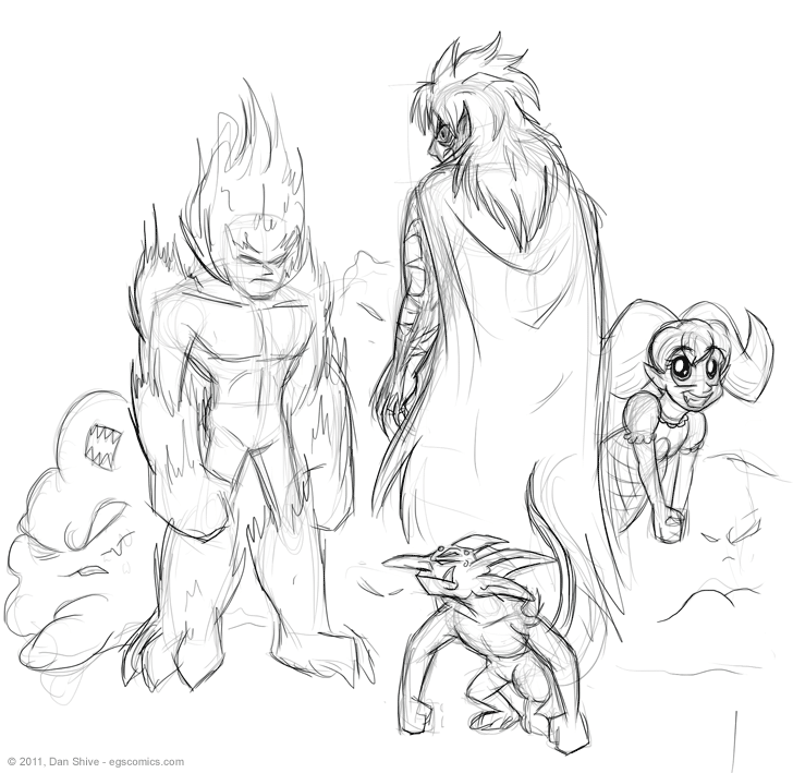 Fire... sorta... guy!Pretty much just me practice sketching, attempting to streamline the comic's character designs, which remains a goal of mine. Granted, I probably should have drawn each of these characters separately and multiple times if that was my goal, but the idea to draw a group shot got stuck in my head and refused to leave. Jackass.