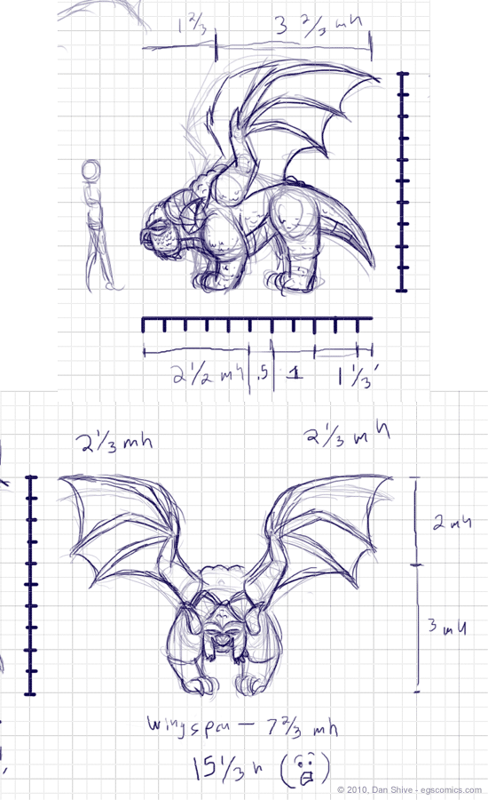 The "mh" notes stand for "Monster Heads". When designing the dragon, I basically decided the height of its head was equal to two average human heads. As such, "mh" = the height of two human heads, or the height of one "monster" head.