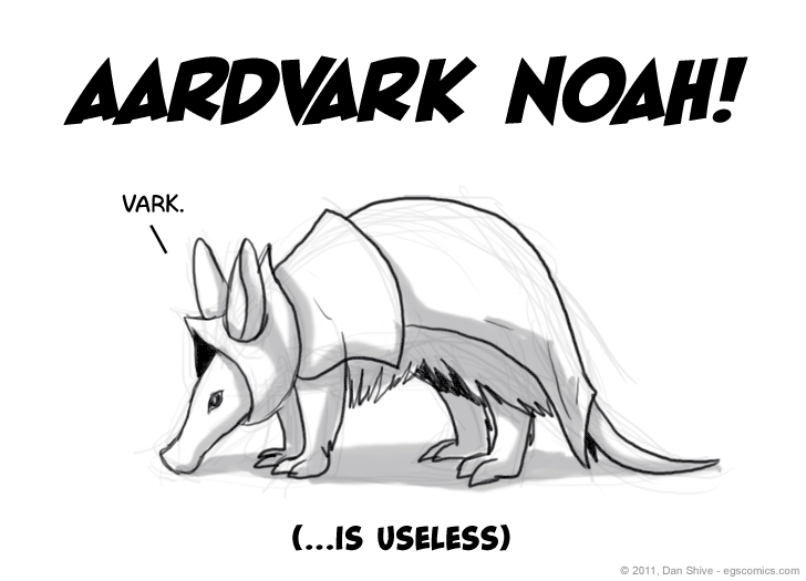 Actually, looking back at that comic commentary, I said Aardvark Noah would be able to talk and use magic, so I guess he's just saying "vark"? That's probably not a good sign. The again, the magic would potentially make it possible that he might be able to do SOMETHING against a dragon, so maybe he wouldn't be useless. And hey, if anyone as an ant problem, he's your man! Aardvark. Whatever.