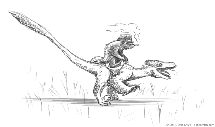 story comic commentary: "Unless... yes. There is still one option available to me. The story must shift focus to velociraptor-riding honey badger cowboys. It is the only way."I'm aware that the honey badger's smoking habit isn't a good one and is in fact extremely unhealthy and deadly and whatnot, but it's worth noting that it is authentic to the era in which cowboys rode on dinosaurs. It's also worth noting that this is a honey badger, and he doesn't care what you think.