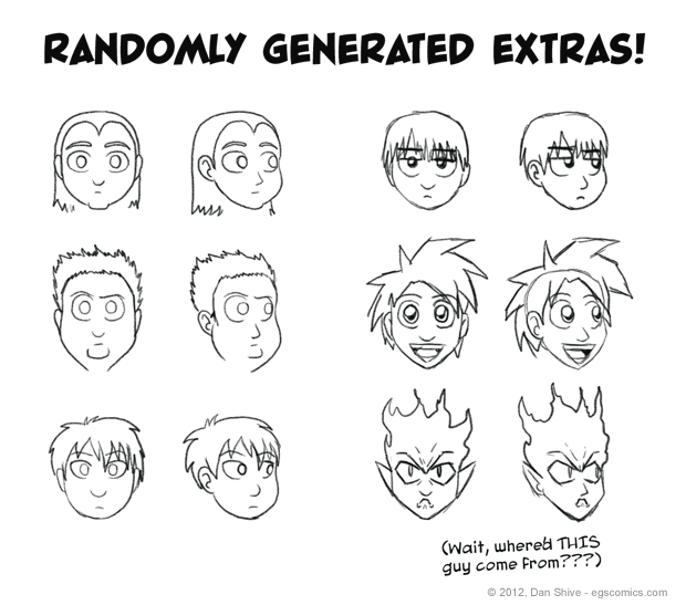 This sketchbook, then, is simply the result of me testing it out by making various faces with it. It's a work in progress and I put little to no effort into their hair (obviously), but frankly, something like this could be a lifesaver for crowd scenes. Heck, it could be fun to set up tables and randomly generate the background extras in future scenes.