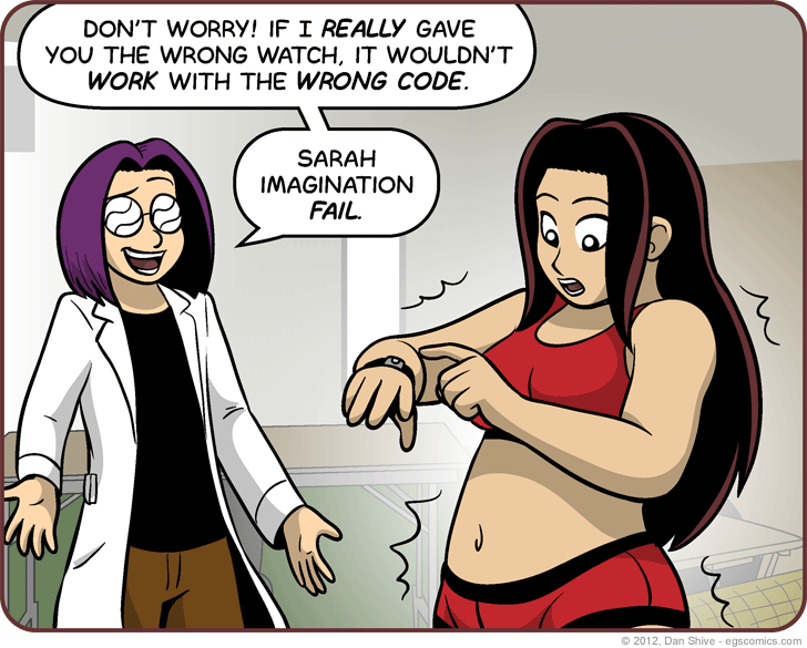From the June 20, 2012 comicI actually forgot to rant in the commentary about the faulty logic of Sarah's fantasy given that the watches are specifically designed to only work if you know full well what the watches are, what they do, how they work, what code to use, etc. Even if all the other safeguards failed, the whole "you think this X times before releasing to cast" is kind of a deal breaker were Tedd to actually give Nanase the wrong watch.