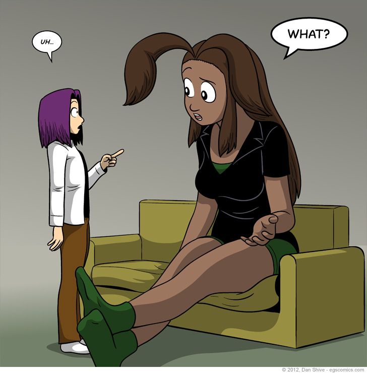 In any case, here's giant Grace! Or small Tedd with small sofa and normal-sized Grace. I'm guessing it's the former, but given that I went with the mysterious fog of mysterious comic-ness for the background, it's anyone's guess, really. Heck, for all we know, Grace is half her normal size in this image.