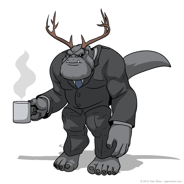 Granted, this isn't precisely what was requested. The actual request was "Stompalope in an office setting", and this is "Stompalope in a business suit and no setting". Well, this is a comic. A white void can represent anything! Let's say he's at a pool party and is severely over-dressed.