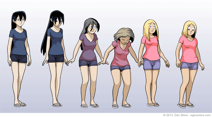 This transformation was a bit of an experiment with having a transformation sequence with a bit of elasticity to it. I think it would have been ultimately more effective if I had exaggerated certain key points in the transformation more, as the intent was for Susan to sort of "morph past" the point where she'd match Sarah's form in the fourth image, but then bounce back and settle into Sarah's actual form.
