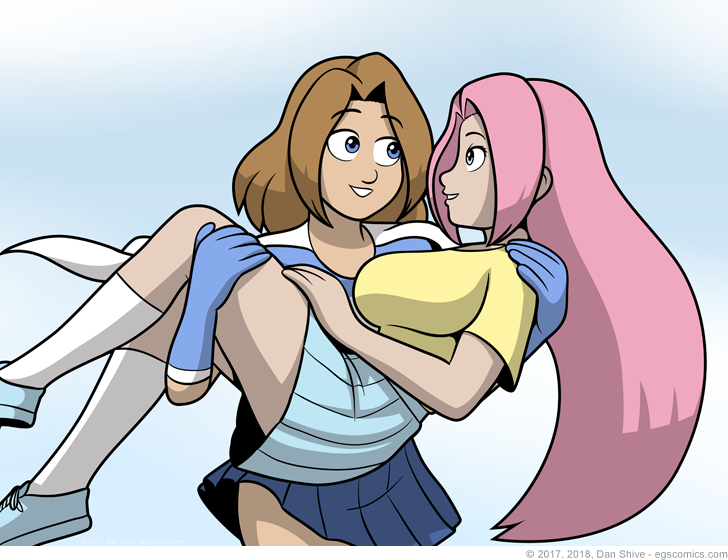 This being a non-canon pinup, I have no idea what exactly is going on here. Were this canon, I'd just say this is Elliot as Cheerleadra with Ashley or Tedd or some other volunteer helping prove that "Mall" Elliot and Cheerleadra aren't the same person. I'm not sure WHY they'd want to prove this, what with it taking suspicion off of Elliot, but that at least addes up.