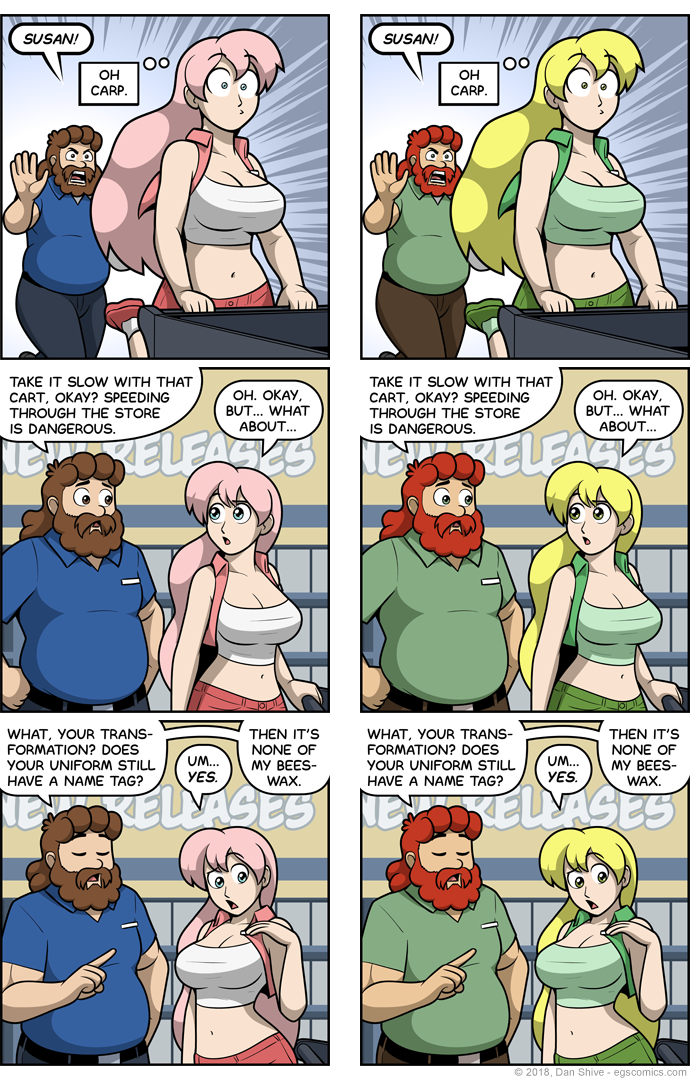 ANYWAY, my main goal on the left version was a background that worked for the rental shop without clashing with the uniforms or foreground characters. I settled on a lower saturation blue of a slightly different hue for the background to give the impression of it going with the uniforms without blending too much with them.