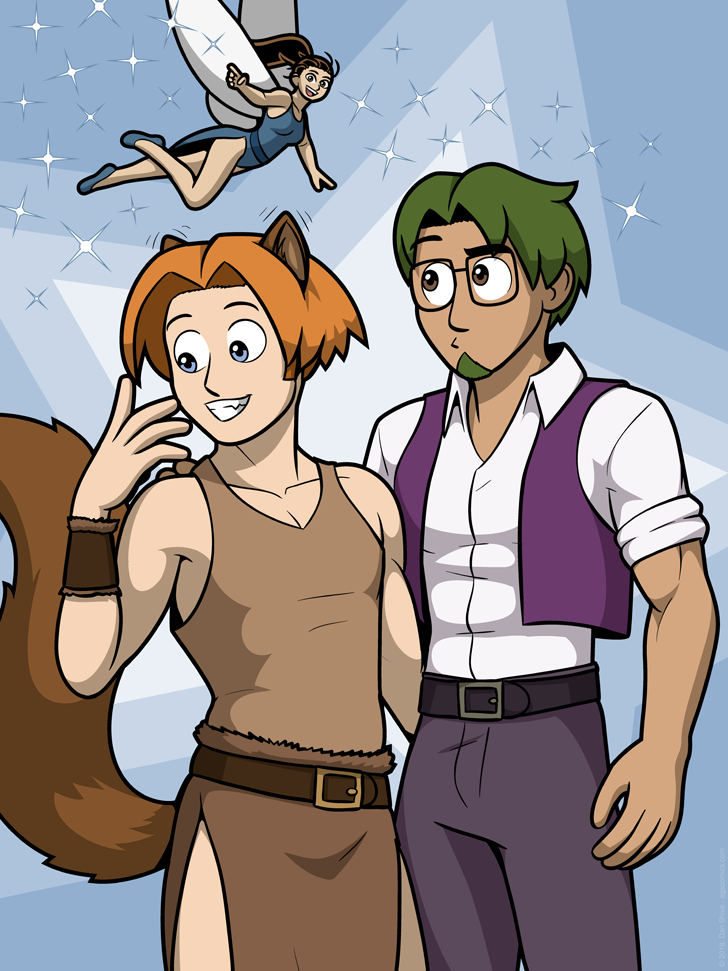 Eventually, it was getting late, and ultimately what I really wanted to draw, at the core of it, was Justin with ears and a tail like that in a sort of "wildman" outfit that's clearly been sewn by a machine, Luke in an outfit with a collar, and Ashley as a fairy who is undoubtedly behind the scenario, strongly implying that this may well be a scenario she's written.