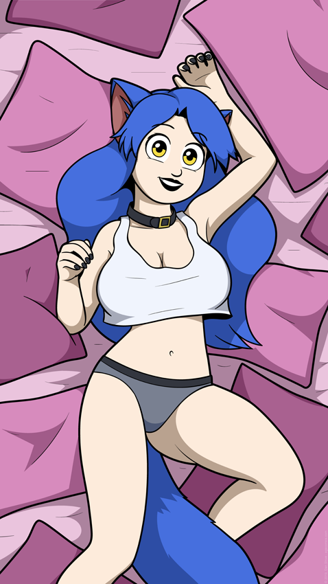 Description - Felix the catgirl lying on her back with a bunch of pillows