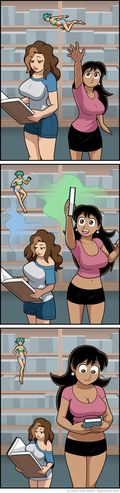 I also wanted an excuse for the size change, and I liked the idea of Rhoda reaching for something, but I found myself not wanting Rhoda to be responsible.