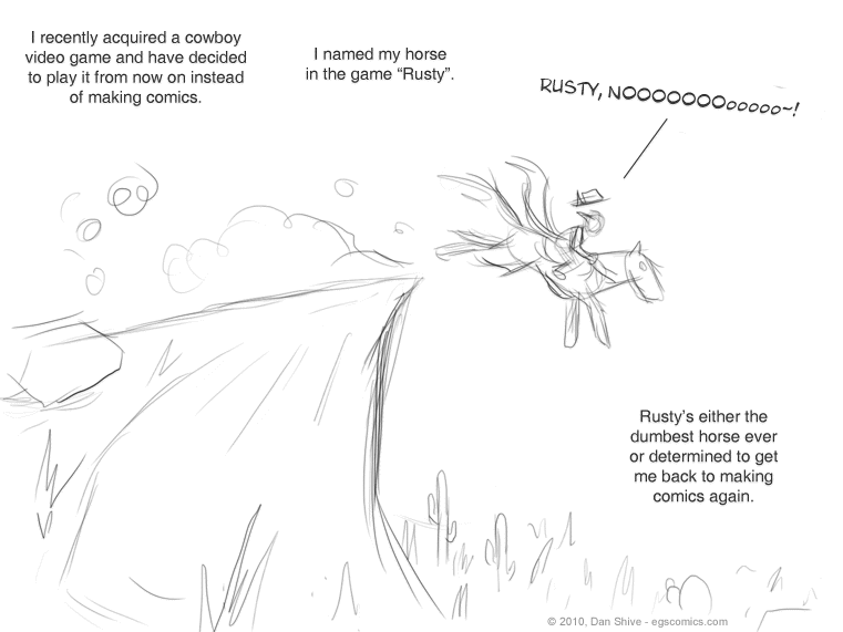 As one may have guessed, I've been playing Red Dead Redemption. I've had a busy Memorial Day weekend beyond that and most of my more relevant sketches are still spoiler-tastic, so I figured I may as well draw myself riding a horse over a cliff. Whee!