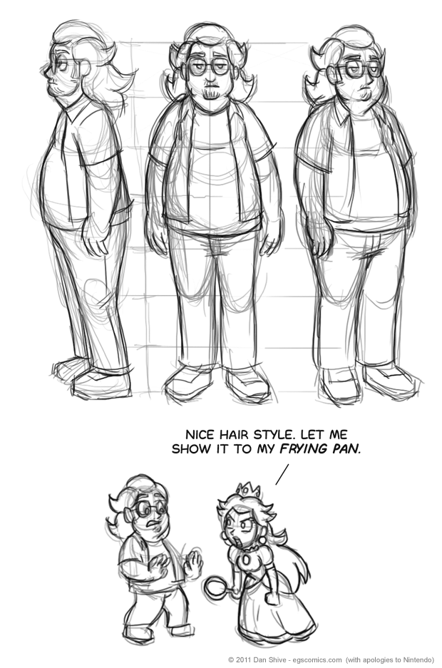 Left to my own devices, I will wind up drawing Princess Peach-like hairstyles frequently. Something about the hair twisting upwards seems to come naturally to me. One may have noticed Dex has a similar thing going on with his hair, but it's apparently particularly noticeable with George as I've gotten many comments on it.