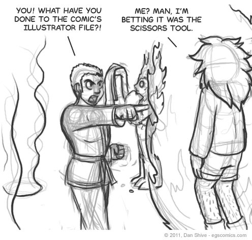 As much as I would recommend Photoshop or similar programs to most cartoonists, I've taken to the madness that is Illustrator. Unfortunately, the Illustrator file became corrupt before I had made a separate, flat high res version of it (and subsequently the website version), and it happened in such a way that I didn't know it was corrupt until it was too late.