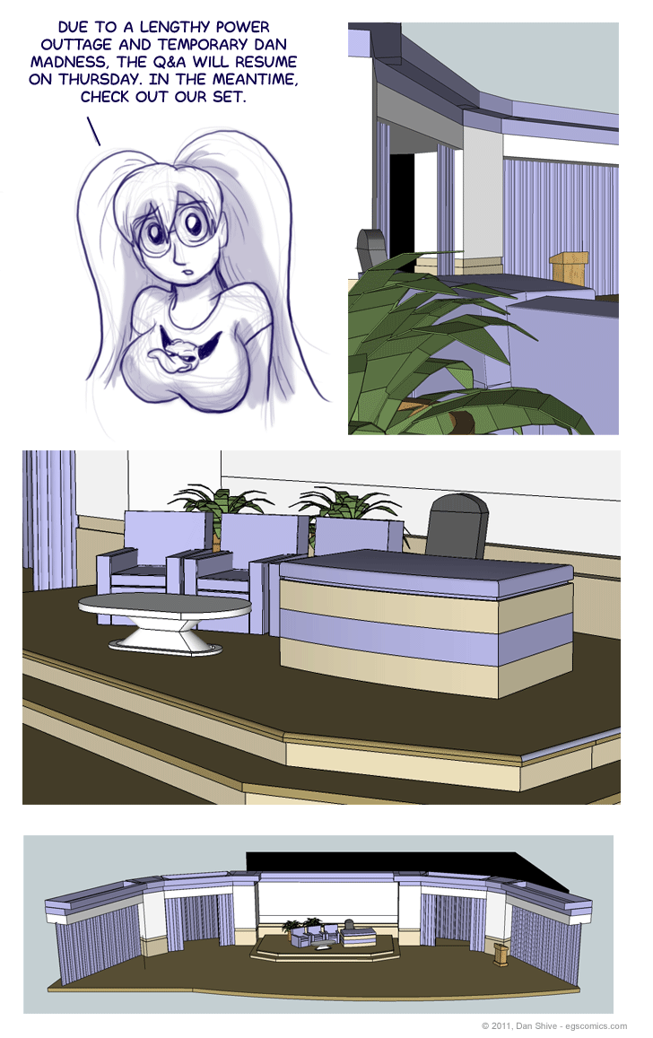 Anyway, this is the 3D set I made for the Q&A. I made everything from scratch with the exception of Amanda's chair, which explains why the base of that table is so weird. I'm capable of making a table with a less strange, base, sure, but I didn't feel like repeatedly drawing table legs. This fear was evidently unfounded, however, as the table has only been barely visible